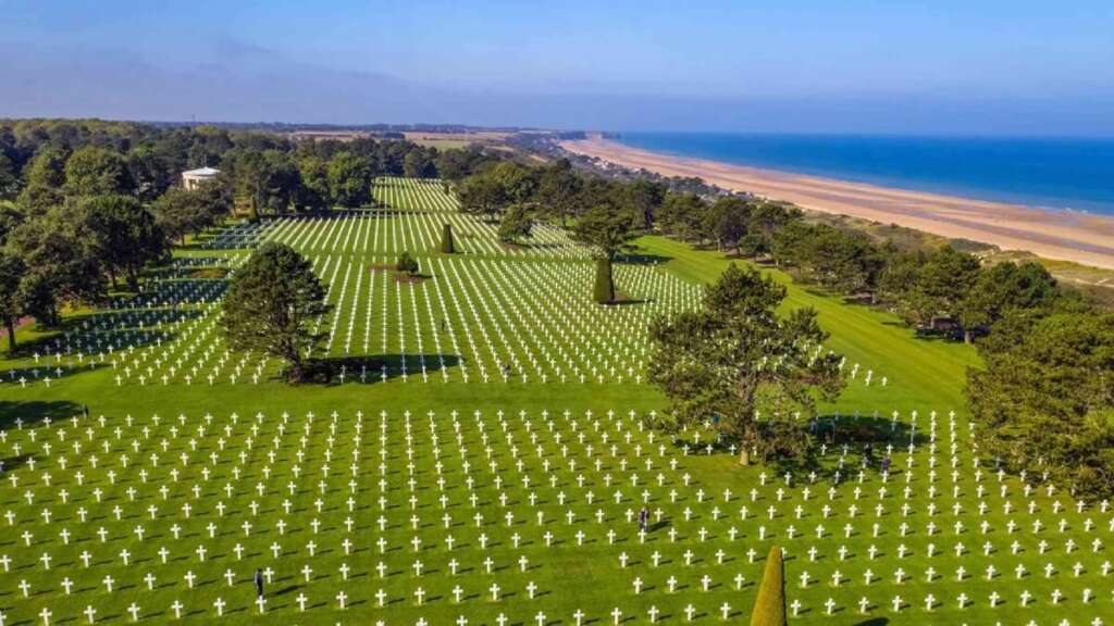 Η διαδρομή συνεχίζεται προς την Omaha Beach, την πιο αιματηρή ακτή της Απόβασης. Κάνουμε μια σύντομη στάση εκεί και συνεχίζουμε προς το Αμερικανικό Νεκροταφείο (Normandy American Cemetery), με τους 9.387 σταυρούς που κοιτούν προς τον ορίζοντα μετατρέποντας το τοπίο σε έναν τόπο συλλογικής ευρωπαϊκής μνήμης.