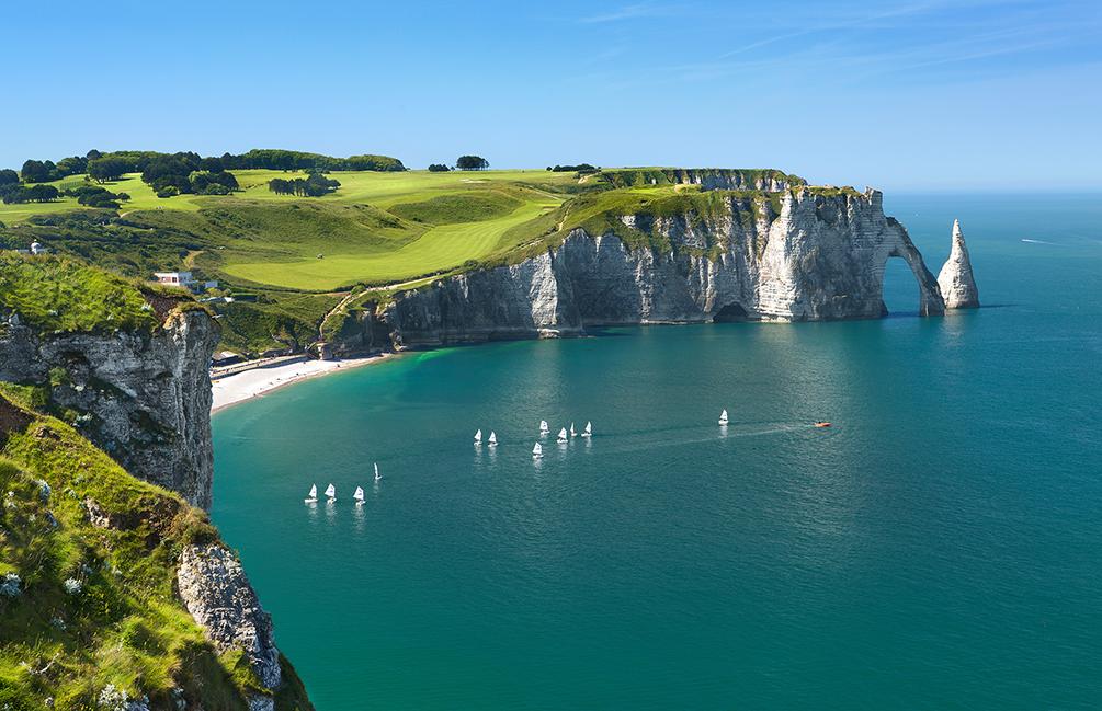 Αφήνοντας την πόλη, κατευθυνόμαστε προς το Étretat, ένα από τα πιο εμβληματικά φυσικά τοπία της Γαλλίας. Οι θεαματικοί λευκοί βράχοι, οι φυσικές καμάρες και η κάθετη “βελόνα” (l’Aiguille) της ακτής που δεσπόζει στο τοπίο της Côte d’Albâtre, συνθέτουν ένα σκηνικό που ενέπνευσε τον Claude Monet δεκάδες φορές. Ακολουθούμε πεζή ένα εύκολο τμήμα του μονοπατιού GR21, με πανοραμική θέα στη θάλασσα και στο χωριό.